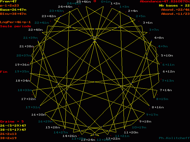 Le graphe est semblable pour les bases 26, 73, 120, 167, etc... et plus généralement pour toutes les bases de forme 26 + 47n . Pour le visualiser, on partage simultanément le cercle en 47 et 26 parties égales. (les points rouges)