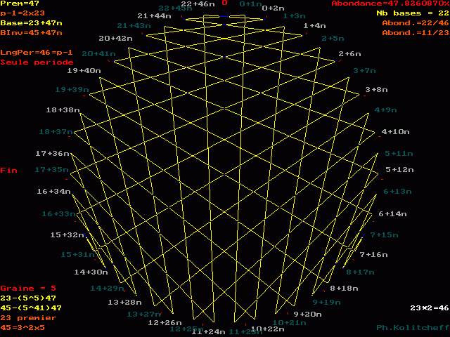 L'inverse de 45 étant (23) le plus petit, c'est le graphe de 23 + 47n qui répertorie les bases de forme 45 + 47n :