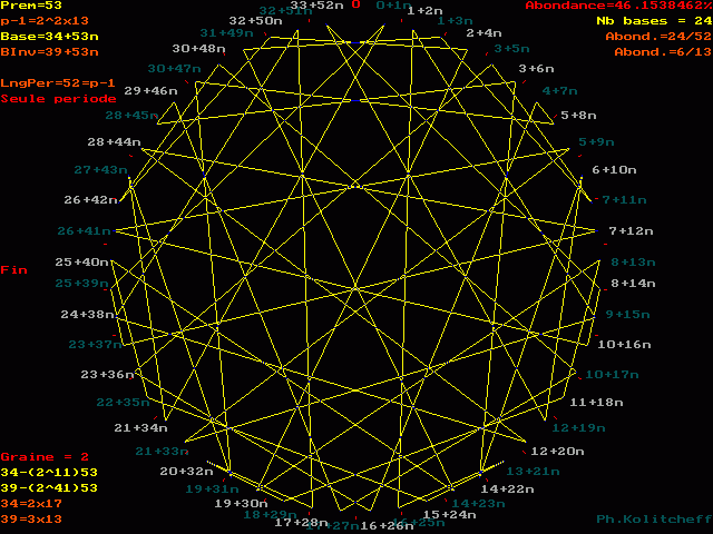 Le graphe est semblable pour les bases 34, 87, 140, 193, etc... et plus généralement pour toutes les bases de forme 34 + 53n . Pour le visualiser, on partage simultanément le cercle en 53 et 34 parties égales. (les points rouges)