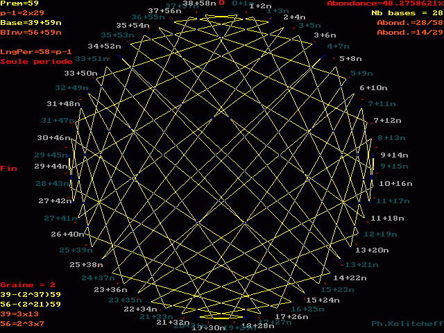 L'inverse de 56 étant (39) le plus petit, c'est le graphe de 39 + 59n qui répertorie les bases de forme 56 + 59n :