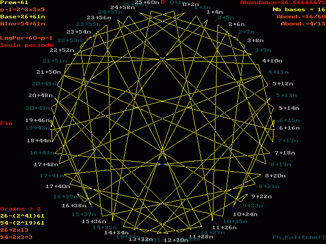 Le graphe est semblable pour les bases 26, 87, 148, 209, etc... et plus généralement pour toutes les bases de forme 26 + 61n . Pour le visualiser, on partage simultanément le cercle en 61 et 26 parties égales. (les points rouges)