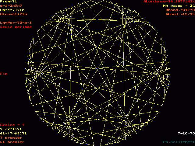 Les points du graphe (les chiffres de la période) sont disposés dans l'ordre suivant en base 7+71n :