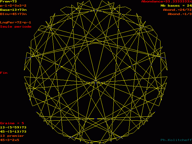 Le graphe est semblable pour les bases 13, 86, 159, 232, etc... et plus généralement pour toutes les bases de forme 13 + 73n . Pour le visualiser, on partage simultanément le cercle en 73 et 13 parties égales.