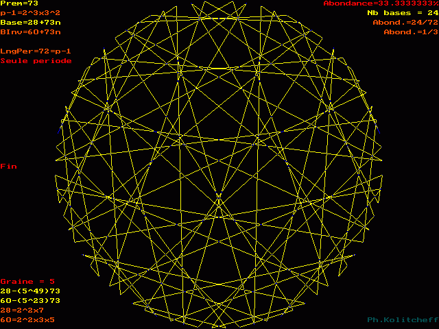 Le graphe est semblable pour les bases 28, 101, 174, 247, etc... et plus généralement pour toutes les bases de forme 28 + 73n . Pour le visualiser, on partage simultanément le cercle en 73 et 28 parties égales.