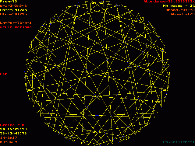 Le graphe est semblable pour les bases 34, 107, 180, 253, etc... et plus généralement pour toutes les bases de forme 34 + 73n . Pour le visualiser, on partage simultanément le cercle en 73 et 34 parties égales.