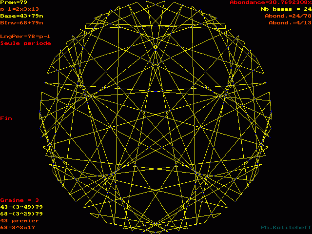 Le graphe est semblable pour les bases 43, 122, 201, 280, etc... et plus généralement pour toutes les bases de forme 43 + 79n . Pour le visualiser, on partage simultanément le cercle en 79 et 43 parties égales.