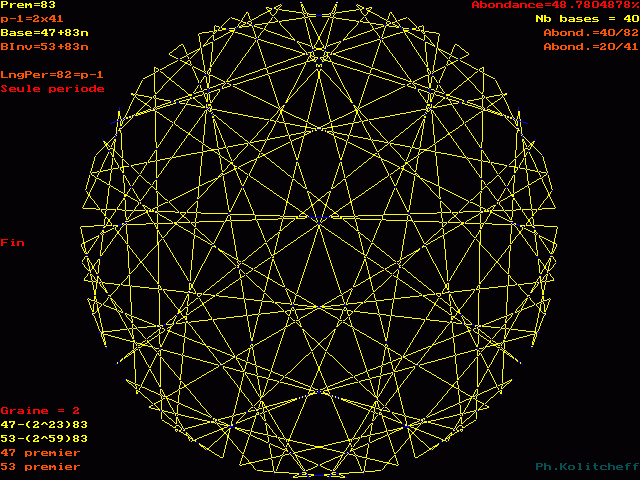 Le graphe est semblable pour les bases 47, 130, 213, 296, etc... et plus généralement pour toutes les bases de forme 47 + 83n . Pour le visualiser, on partage simultanément le cercle en 83 et 47 parties égales.