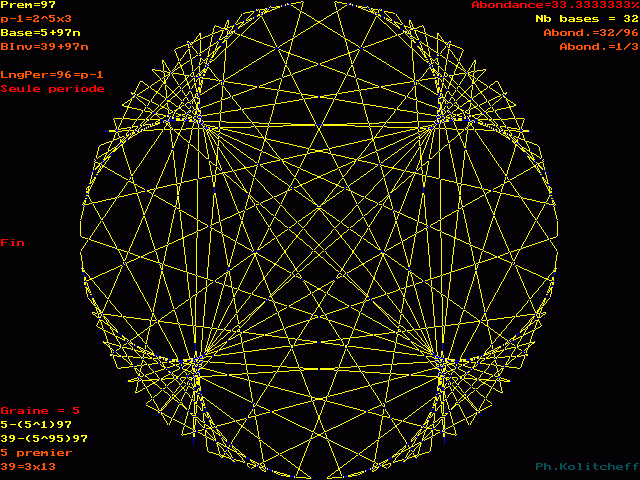 Le graphe est semblable pour les bases 5, 102, 199, 296, etc... et plus généralement pour toutes les bases de forme 5 + 97n . Pour le visualiser, on partage simultanément le cercle en 97 et 5 parties égales.