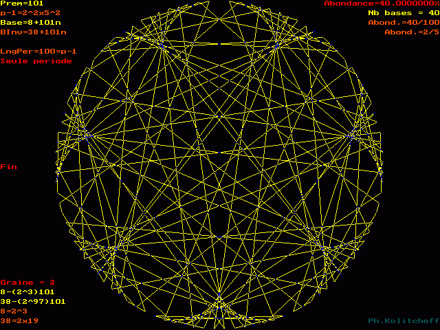 Le graphe est semblable pour les bases 8, 109, 210, 311, etc... et plus généralement pour toutes les bases de forme 8 + 101n . Pour le visualiser, on partage simultanément le cercle en 101 et 8 parties égales.