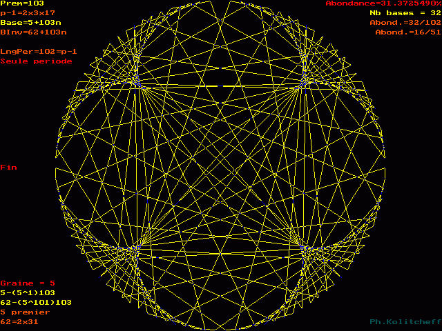 Le graphe est semblable pour les bases 5, 108, 211, 314, etc... et plus généralement pour toutes les bases de forme 5 + 103n . Pour le visualiser, on partage simultanément le cercle en 103 et 5 parties égales.