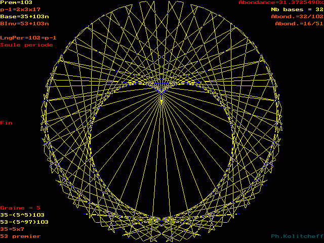L'inverse de 53 étant (35) le plus petit, c'est le graphe de 35 + 103n qui répertorie les bases de forme 53 + 103n :