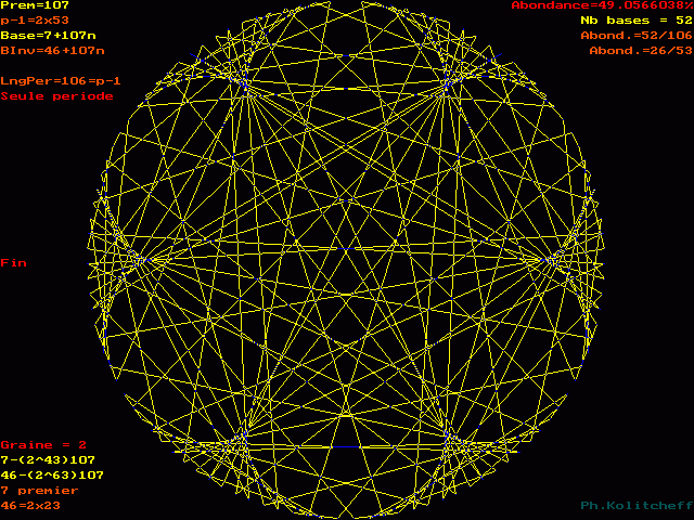 Le graphe est semblable pour les bases 7, 114, 221, 328, etc... et plus généralement pour toutes les bases de forme 7 + 107n . Pour le visualiser, on partage simultanément le cercle en 107 et 7 parties égales.