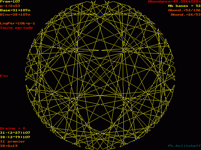 Le graphe est semblable pour les bases 31, 138, 245, 352, etc... et plus généralement pour toutes les bases de forme 31 + 107n . Pour le visualiser, on partage simultanément le cercle en 107 et 31 parties égales.