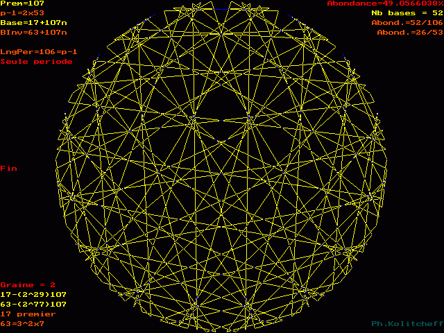 L'inverse de 63 étant (17) le plus petit, c'est le graphe de 17 + 107n qui répertorie les bases de forme 63 + 107n :