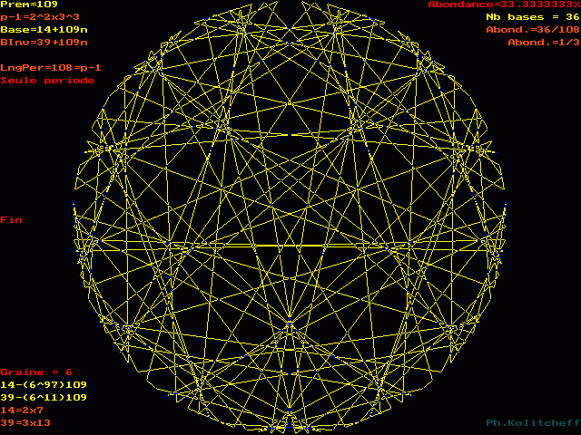 Le graphe est semblable pour les bases 14, 123, 232, 341, etc... et plus généralement pour toutes les bases de forme 14 + 109n . Pour le visualiser, on partage simultanément le cercle en 109 et 14 parties égales.