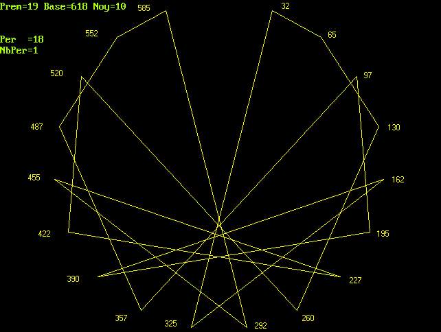 Le calcul de 1/ 19 en base 618 (10 + (32 x 19)) fournis la période :