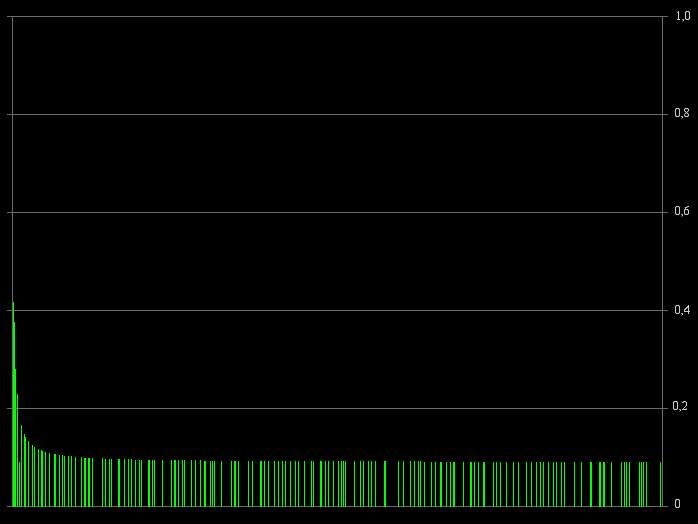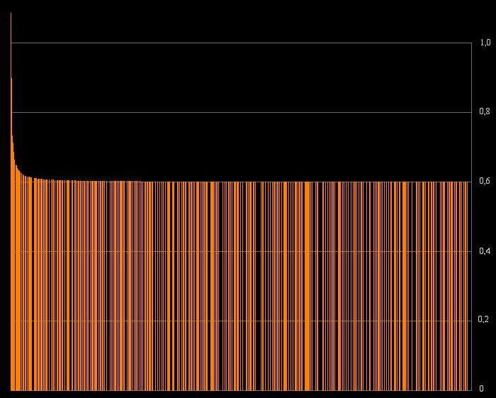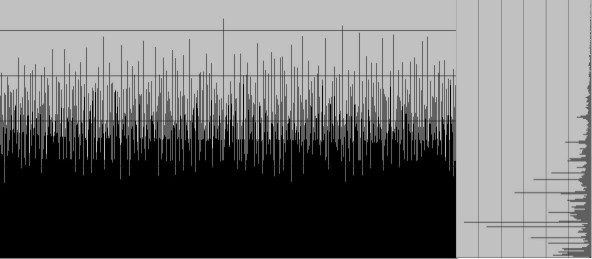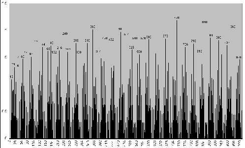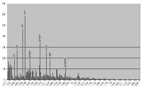 Partons alors du graphe des nombres inférieurs à 10000, et partageons le en ligne horizontale en limitant à deux chiffres après la virgule la valeur de la résonance. On peut alors compter pour chacune des tranches obtenues le nombre de résonance présente.