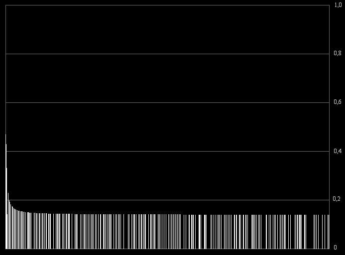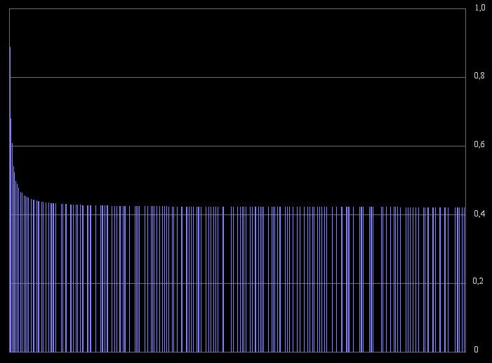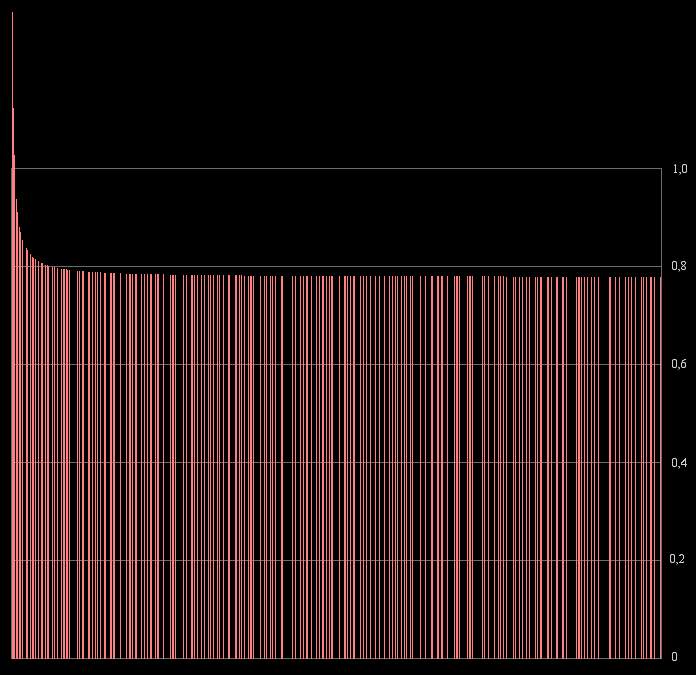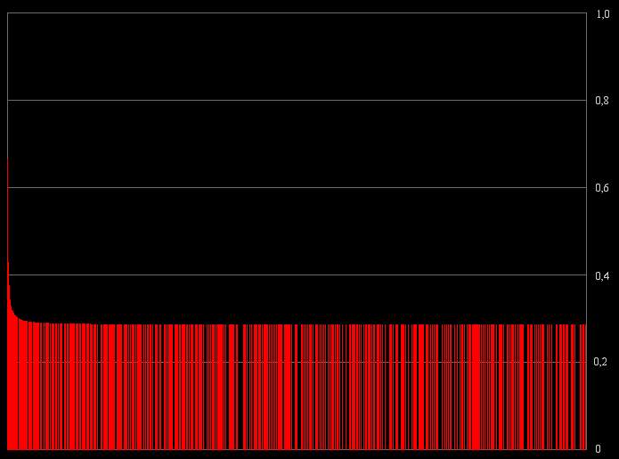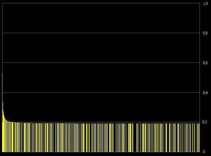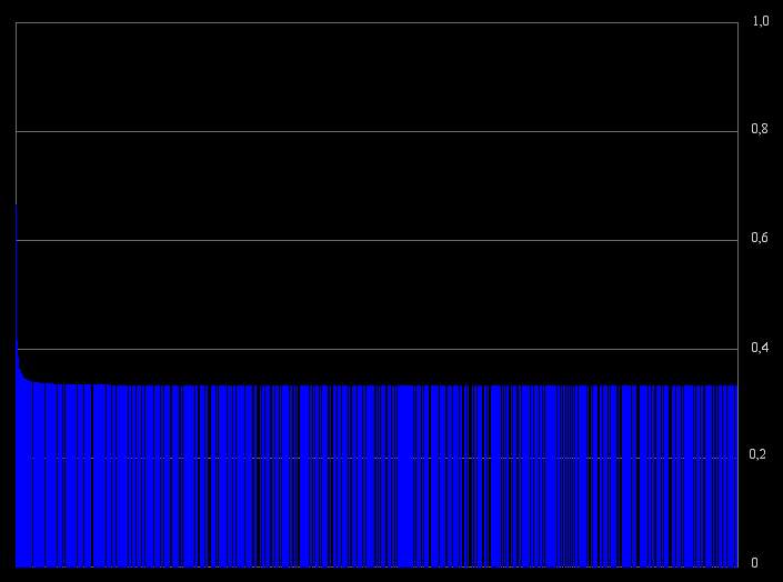 On peut dès lors observer l'étonnante régularité des valeurs obtenues lorsque l'on calcule la résonance des nombres K*P avec P premier et K un nombre constant. Un cap important semble être franchi à 0,33 environ (en bleu) qui correspond à la fois au pic représentant le plus grand nombre de résonance (Voir plus haut), et aux nombres de forme 2*P. En dessous, la constante K est un premier, au dessus, un nombre composé.