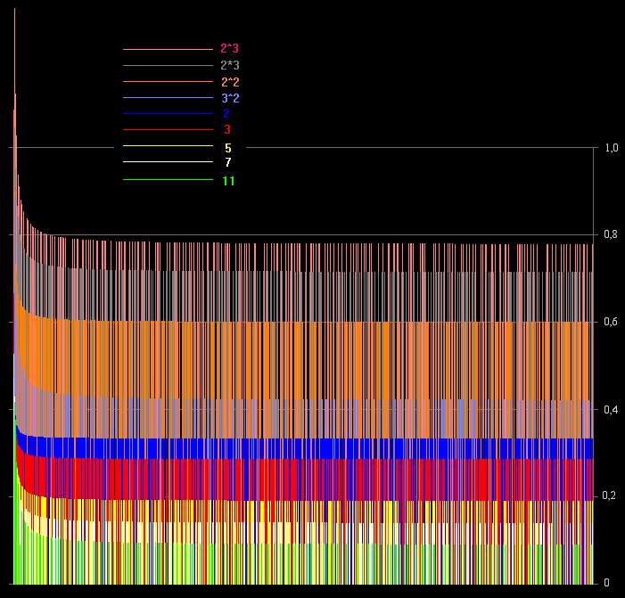 Les deux pics principaux, situés à 0,29 et 0,33 correspondent respectivement aux nombres de forme 3xP ou 2xP, avec P premier. On peut les observer dans la figure suivante, où seules sont représentés les résonances (calculées jusqu'à 10000) des nombres multiples d'un premier et des facteurs suivants dans l'ordre de grandeur de la résonance (pas de quantité, 2 puis 3 sont les plus nombreux).
