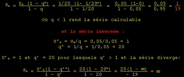 Prenons un exemple simple avec U0 = 0,05 et q = 0,05 tous deux égaux à 1/20. Le coefficient q étant inférieur à 1 la série converge vers 0,05 / (1 - 0,05) = 0,05 / 0,95 = 1 / 19.