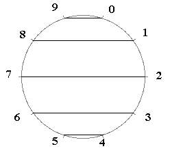 Le microscope numérique est un outil d'observation qui réunit en une figure synthétique l'ensemble des fractions d'un nombre pour une base donnée. Ainsi en base 10, toutes les fractions de n/7 ont pour période 142857 et génèrent alors le graphe suivant, où les points répartis uniformément sur le cercle, sont visités dans l'ordre imposé par cette période. Lorsque l'on calcule n/11, on constate qu'il existe 5 périodes qui se représentent ainsi : En effet, 1/11 = 0,09090909... est le trait du haut. 2/11 = 0,18181818... le trait d'en dessous 3/11 = 0,27272727... 4/11 = 0,36363636... 5/11 = 0,45454545...est le trait du bas. Les périodes sont alors revisitées dans l'autre sens : 6/11 = 0,54545454... 7/11 = 0,63636363... 8/11 = 0,72727272... 9/11 = 0,81818181... 10/11 = 0,90909090... Jusqu'au cas trivial : 11/11 = 0,99999999... = 1 Et le cycle se poursuit à l'infini avec: 12/11 = 1,09090909... Où l'on retrouve la période de 1/11. |